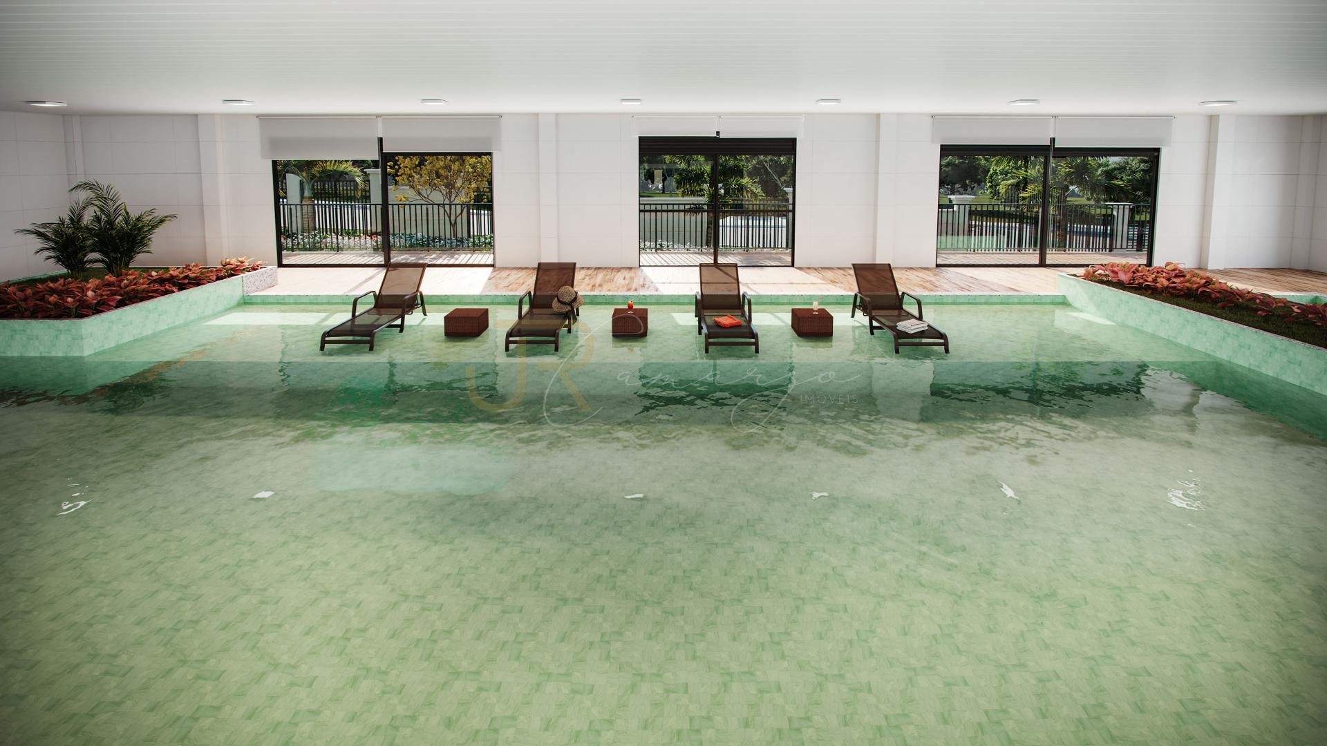 Área de lazer completa com piscina aquecida e coberta