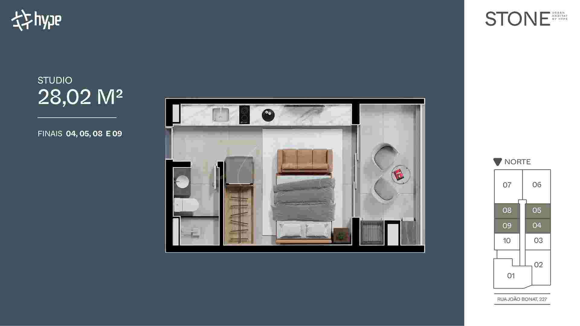 O Stone contará com um total de 70 unidades, com plantas studio, 2 ou 3 quartos com suíte.